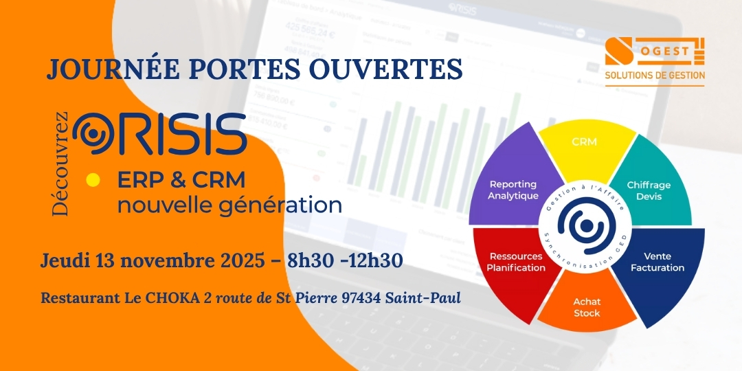 Les entreprises du BTP, des services et des bureaux d’études accélèrent leur digitalisation à La Réunion. Découvrez ORISIS, l’ERP & CRM full web intégré par SOGEST, partenaire exclusif sur l’île. Une solution intuitive pour piloter vos projets, simplifier la gestion et améliorer votre rentabilité. Participez à la Journée Portes Ouvertes…